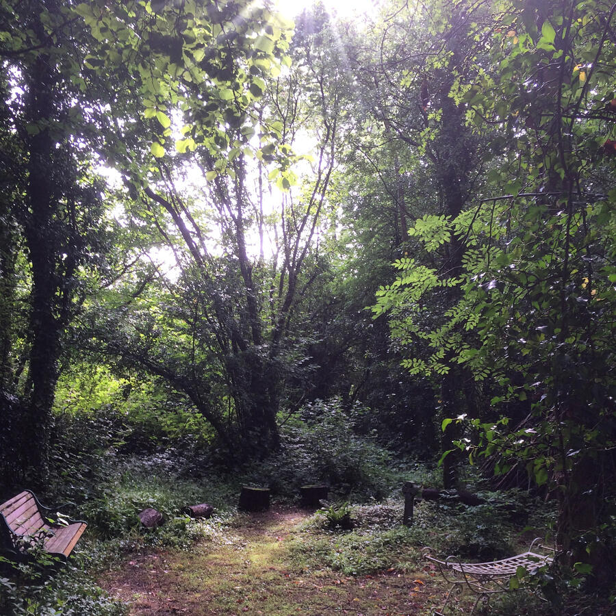 it runs through my mum’s too.What did it all mean?Why had my mum a bracelet that she never took off, inscribed with the Sound of Water?The Well in the GardenToday, I don't have to cycle to the springs.I live with a massive, ancient well in my own garden (3 x 2 metres of deep, deep water).It’s another liminal place,my sacred grove.It always seems to be the way at these old ancient wells;they are a place between worlds,where the veil is thin...They are where I feel the most peace,and the most … home.I could say a lot more, but that is a story for another day.My well is surrounded by trees, as you can see in the photographs.Now, I take my coffee in my dressing gown and wander there in the mornings, mostly in the summer.I sit and watch the darting wrens and the busy blue tits,this time with Maple, Blossom, and Willow beside me.It’s nice to be so private, sitting in the grove of trees.I didn't "learn" to be spiritual from a book.*I remembered it through the water.I think if you have read this far, that’s likely to be you too,